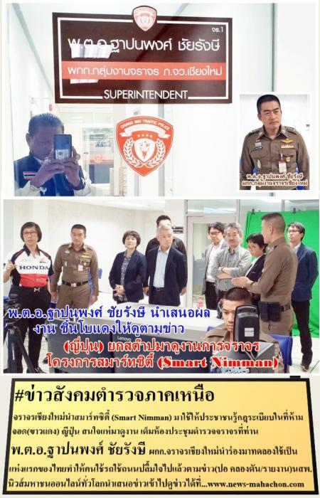 จราจรเชียงใหม่นำสมาร์ทซิตี้ (Smart Nimman) มาใช้ให้ประชาชนรู้กฎระเบียบในที่ห้ามจอด(ขาวแดง) ญีปุ่น สนใจแห่มาดูงาน เต็มห้องประชุมตำรวจจราจรที่ท่าน พ.ต.อ.ฐาปนพงศ์ ชัยรังษี ผกก.จราจรเชียงใหม่นำร่องมาทดลองใช้เป็นแห่งแรกของไทยทำให้คนใช้รถใช้ถนนปลื้มใจไปแล้วตามข่าว